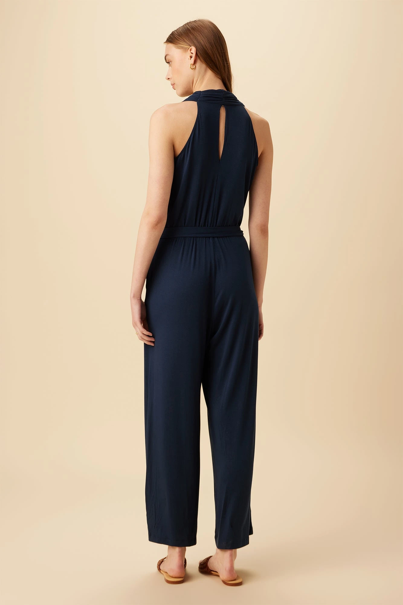 - This wide leg style features a wrap halter top, shirring at the sides, detachable waist tie, pockets and pulls on for ease.