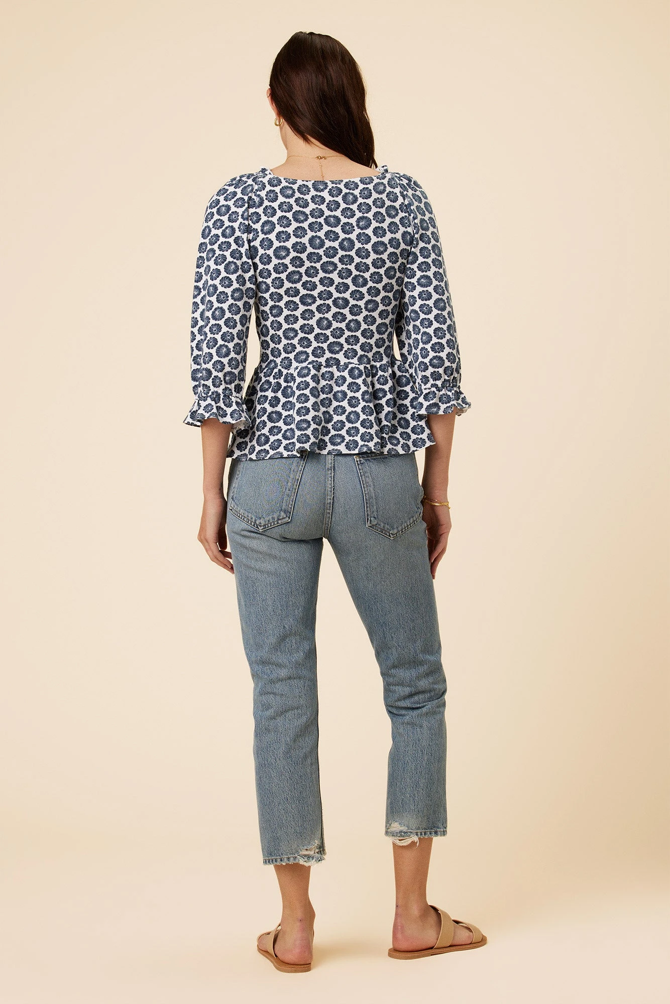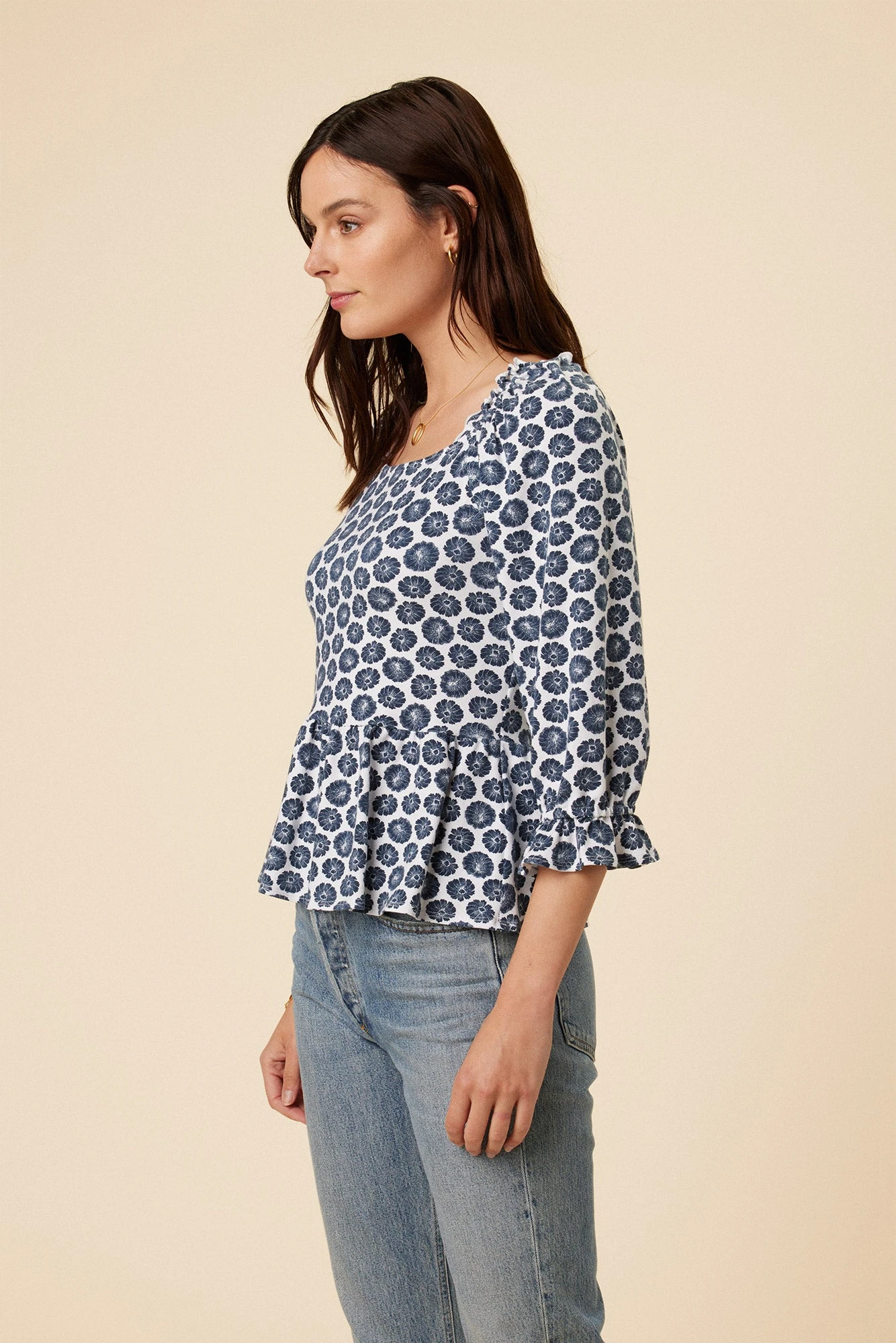 Made from our luxe Reverie Knit, this empire waist, peplum detail blouse with ruffle detailing will be your new go-to top. We suggest pairing untucked with your favorite mid or high rise bottoms.