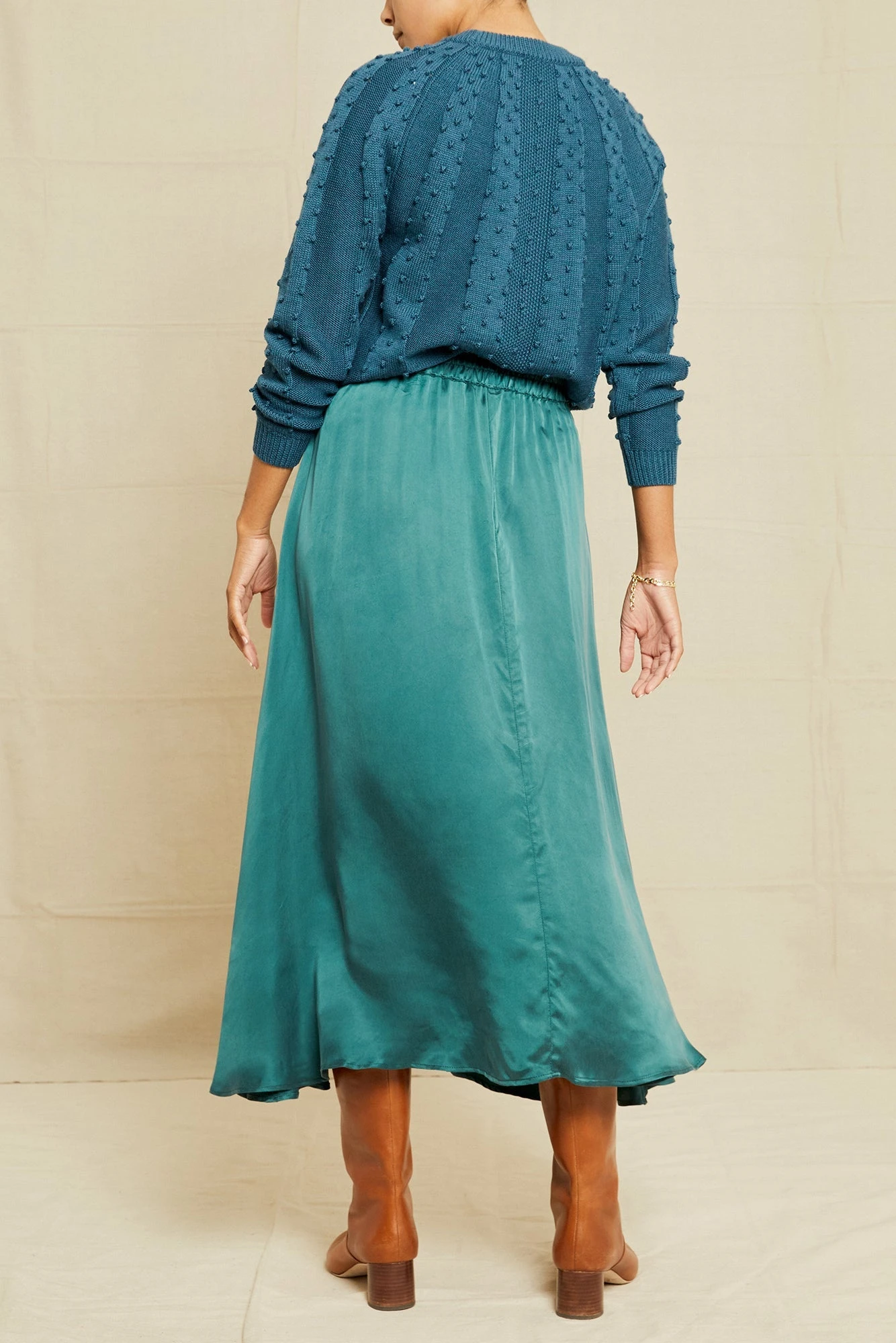 Voluminous midi skirt with a flat front and elastic waist in back, made in our softest plant-based silk alternative, Cottonseed Cupro.