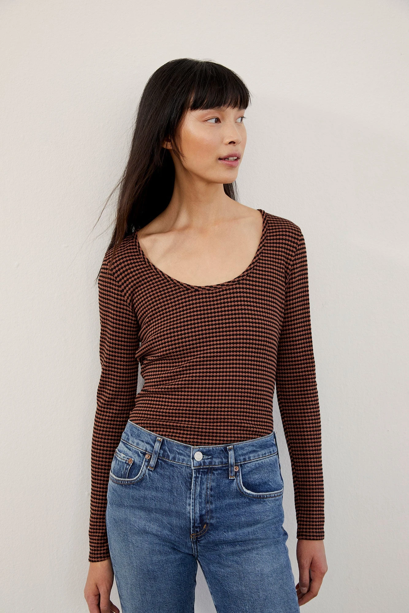 Long sleeve tee with an open neck and shirt-tail hem. A great layering piece, now updated in our super soft scallop knit blend.