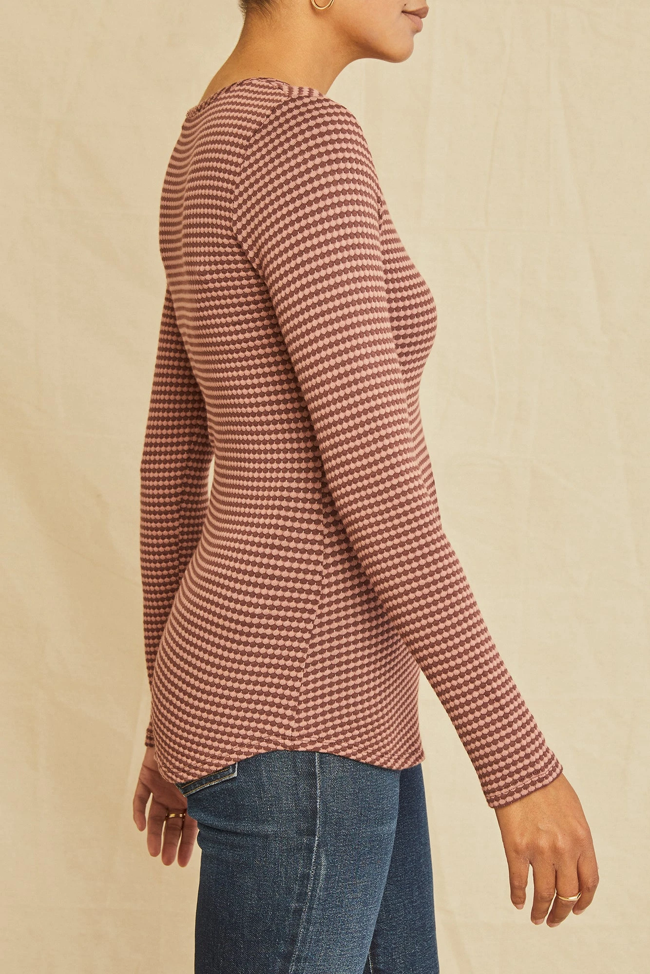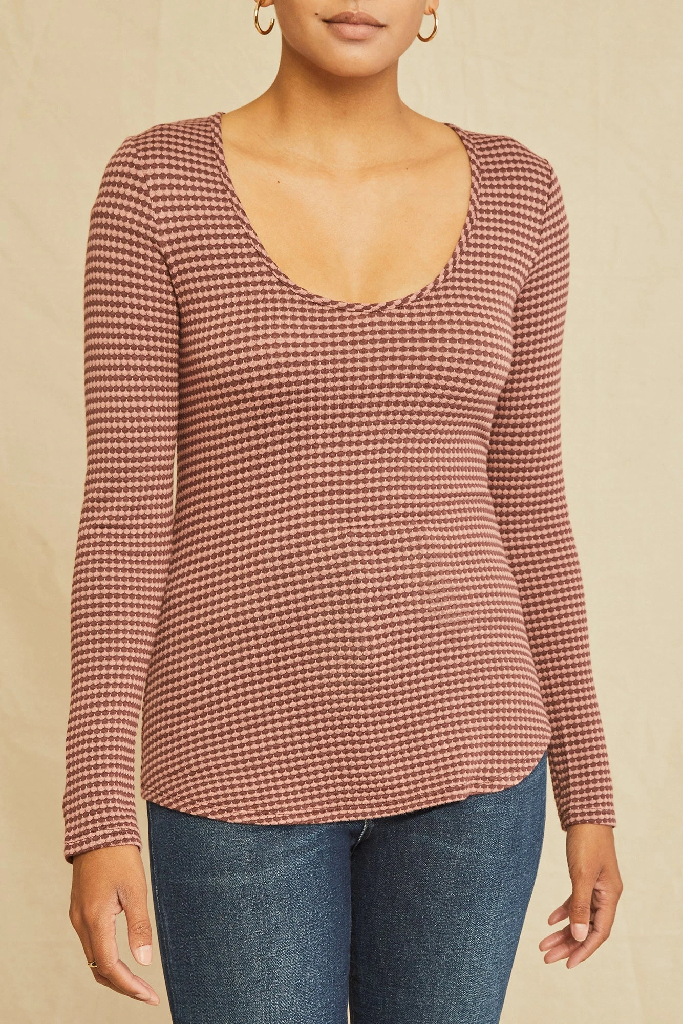 Long sleeve tee with an open neck and shirt-tail hem. A great layering piece, now updated in our super soft scallop knit blend.