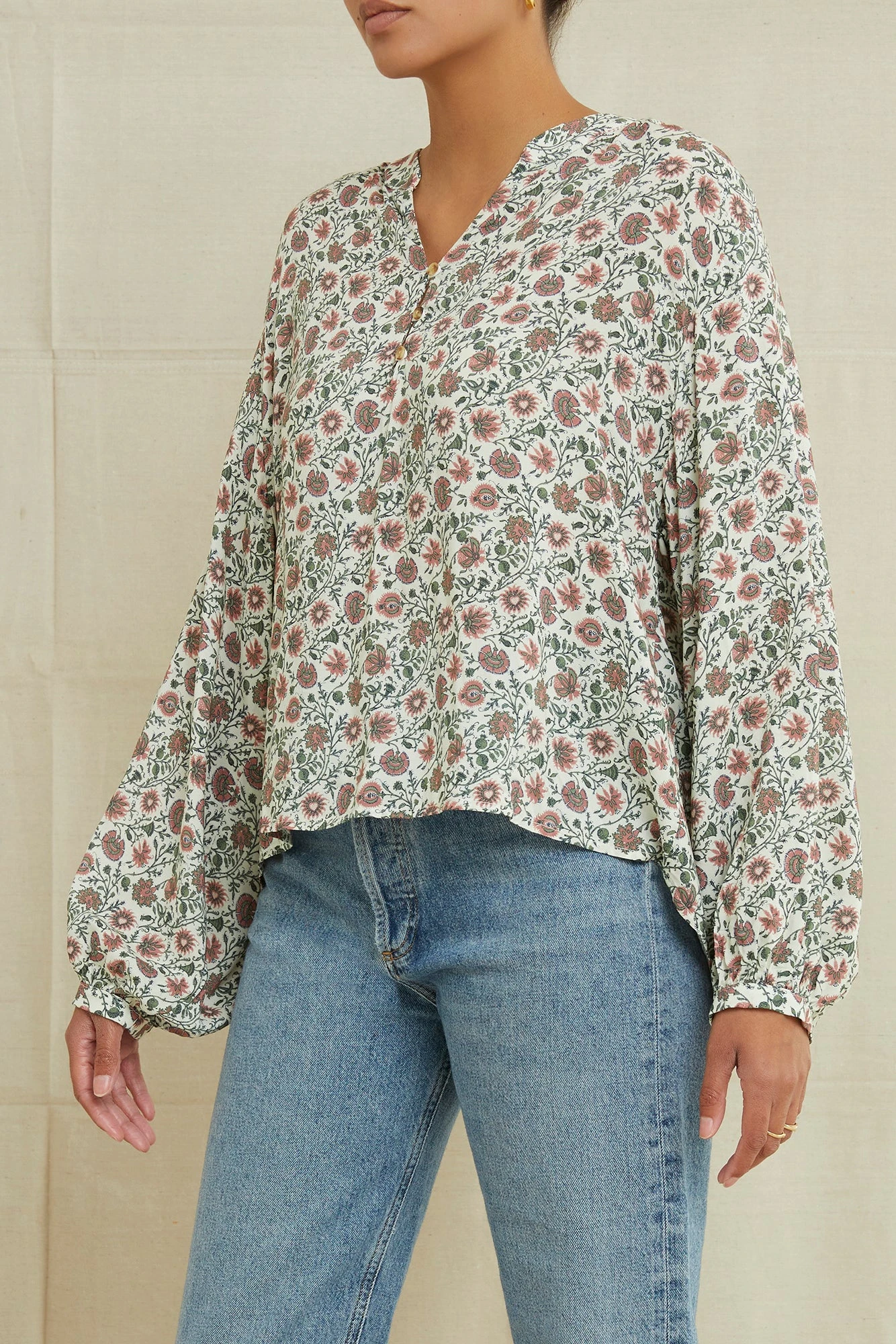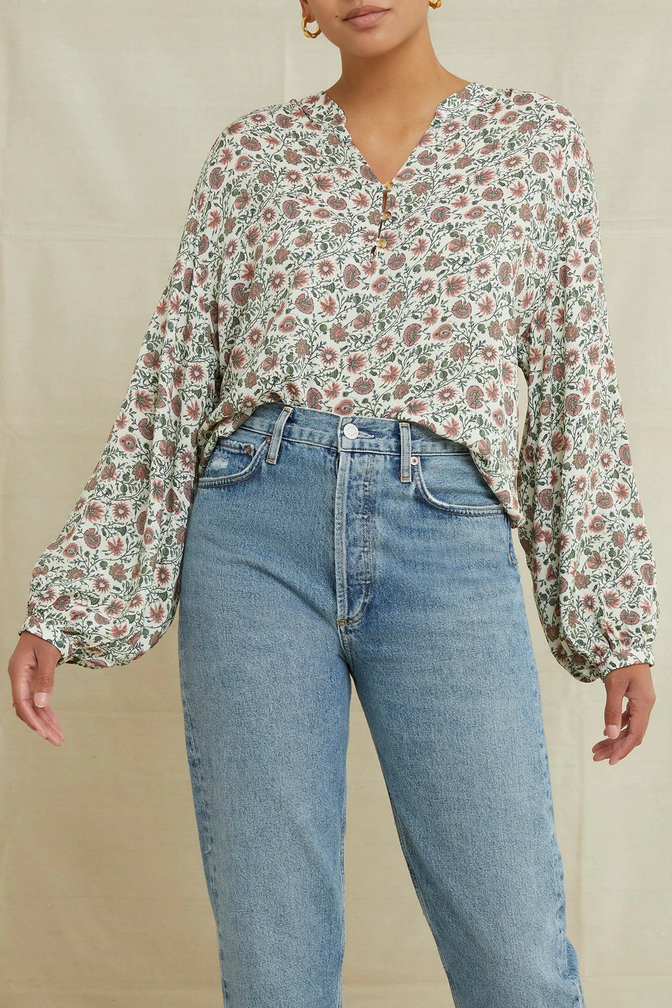 Relaxed fit blouse with long puff sleeves, half placket and elastic loops button closure with a slight high-low hem. We recommend pairing with your favorite midrise bottoms.