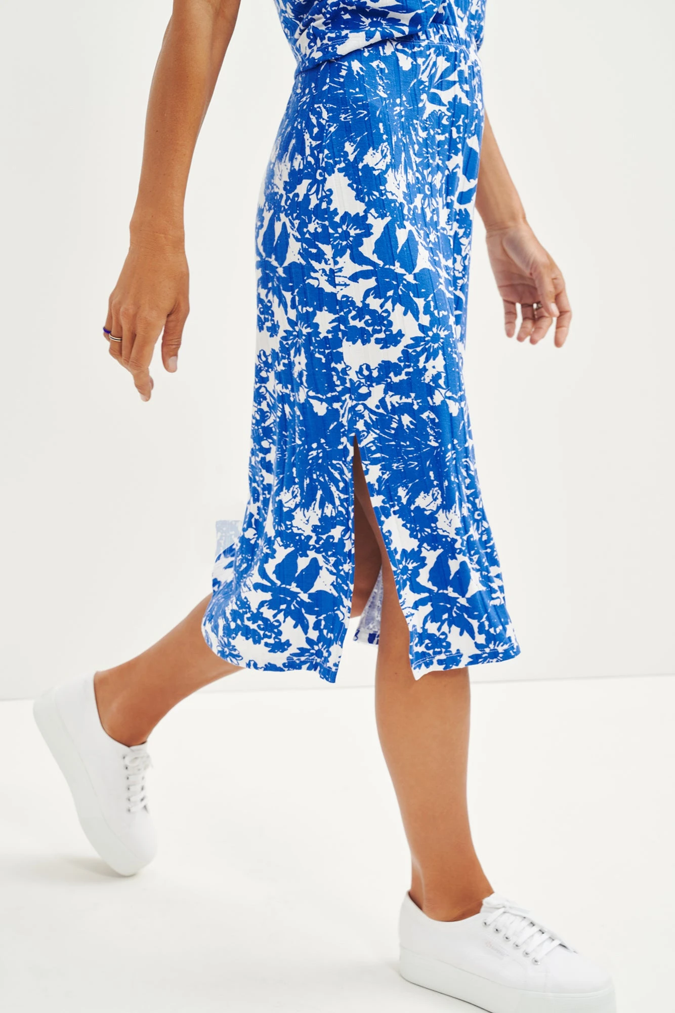 Ribbed skirt with a straight silhouette and side slits that falls below the knee. Made in our signature Provence Rib with the perfect amount of stretch and structure.
